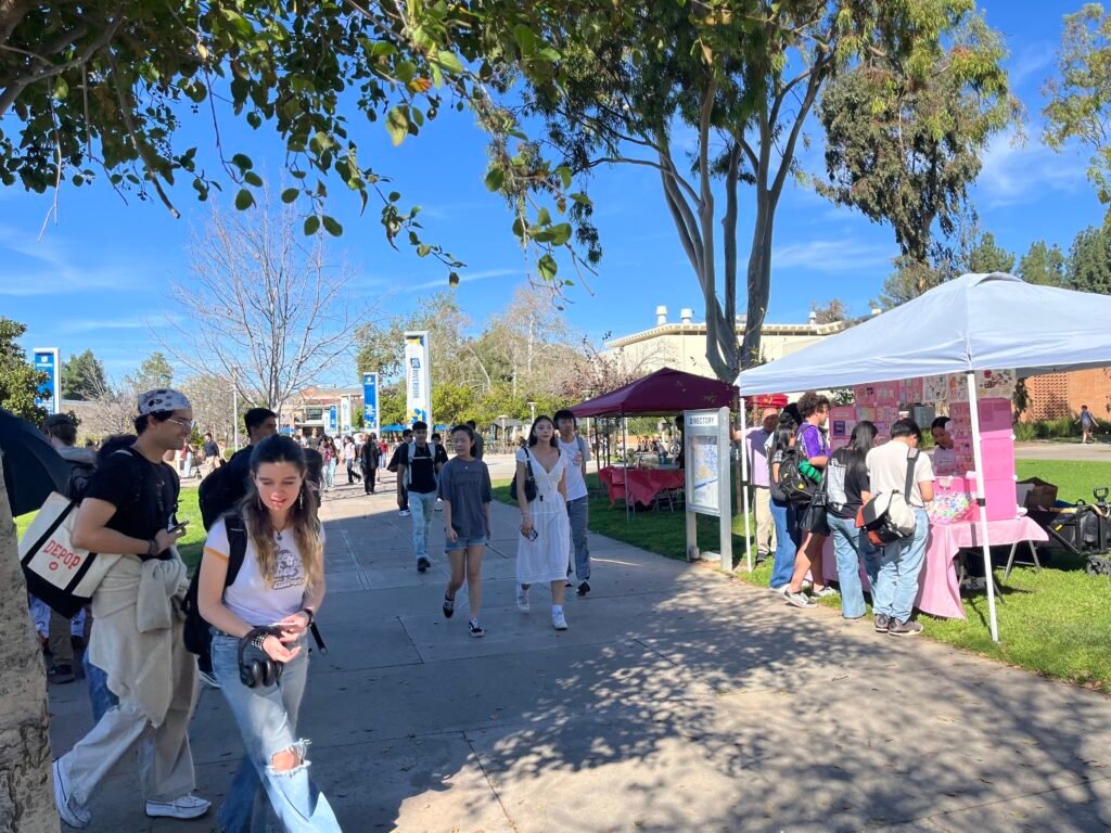 Un jueves por la tarde reciente, el campus de UC Riverside estaba repleto de gente. Las cafeterías y los comedores estaban abarrotados, y los estudiantes acudieron en masa a una venta de arte cerca del campanario de 49 metros de la universidad, el punto de referencia central del campus.